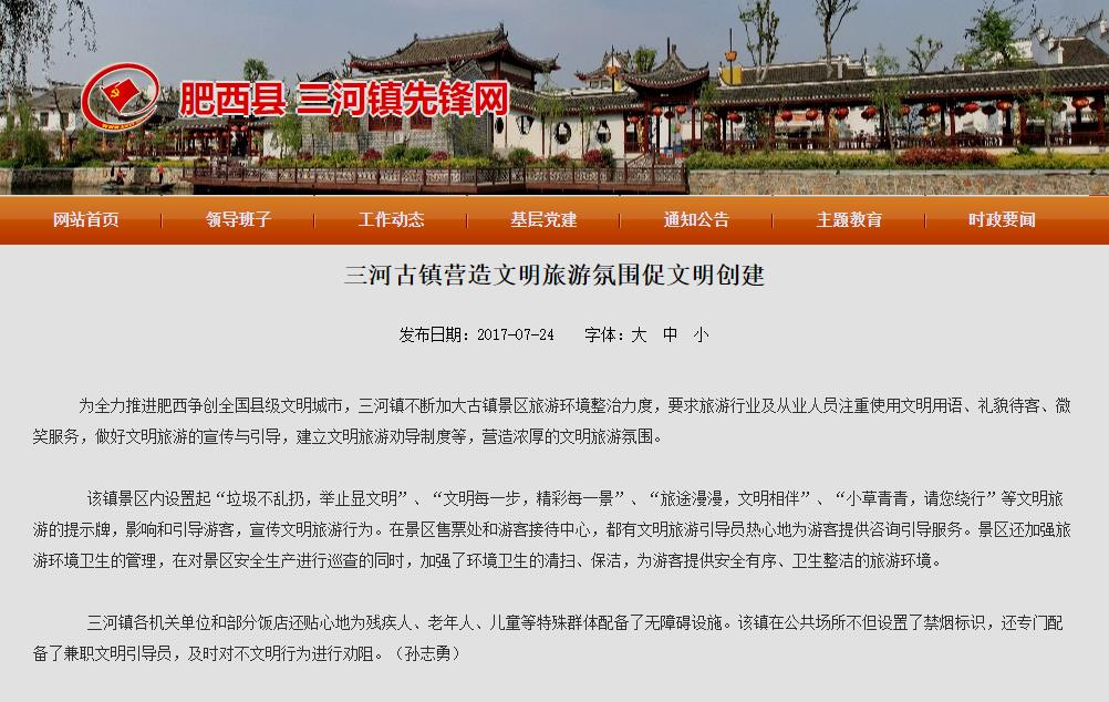 旅游廁所是展示和反映景區(qū)文明水平、旅游服務(wù)質(zhì)量的重要窗口。近年來,三河古鎮(zhèn)景區(qū)大力開展廁所革命,按照“數(shù)量充足、衛(wèi)生文明、實(shí)用免費(fèi)、有效管理”的要求,全力推進(jìn)景區(qū)旅游廁所建設(shè),取得了較好的效果。