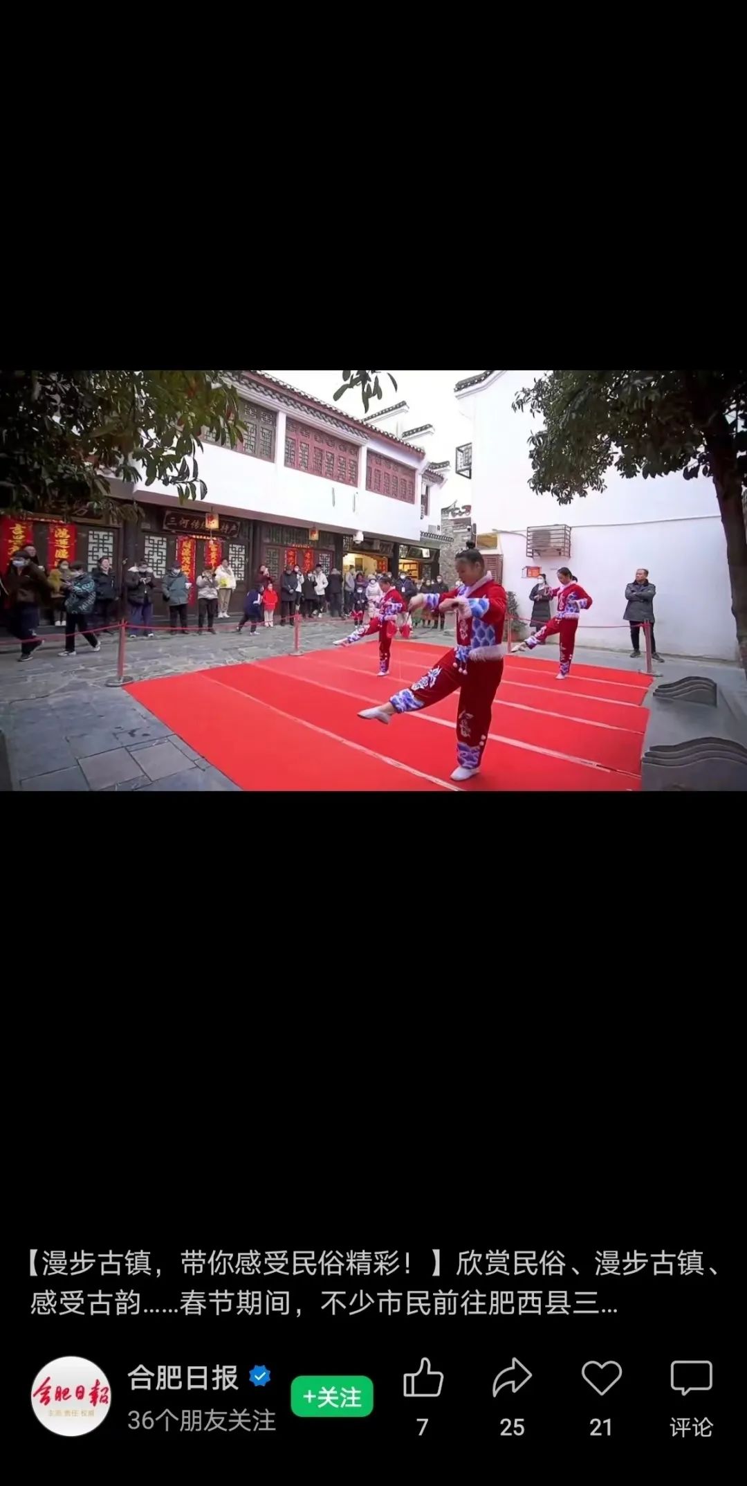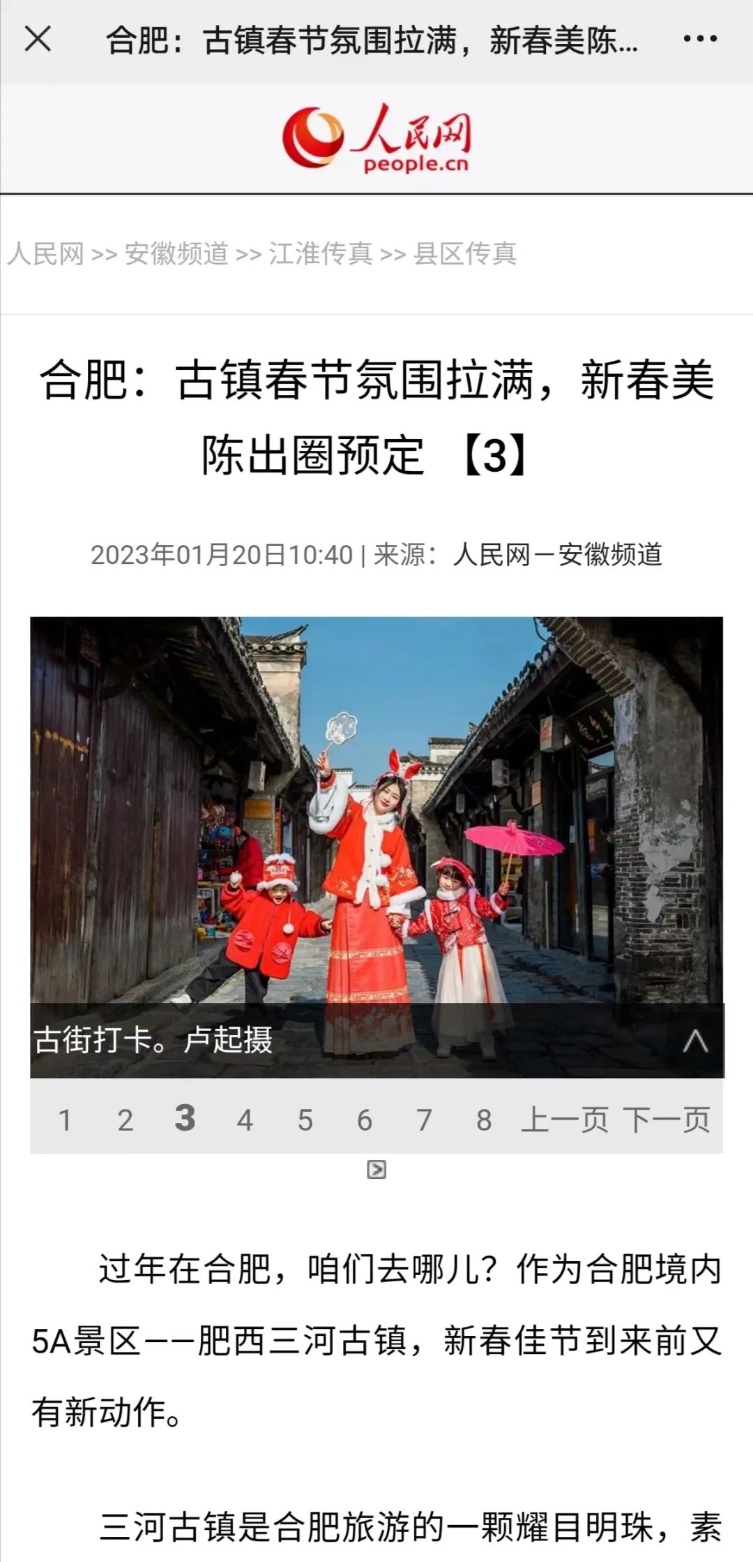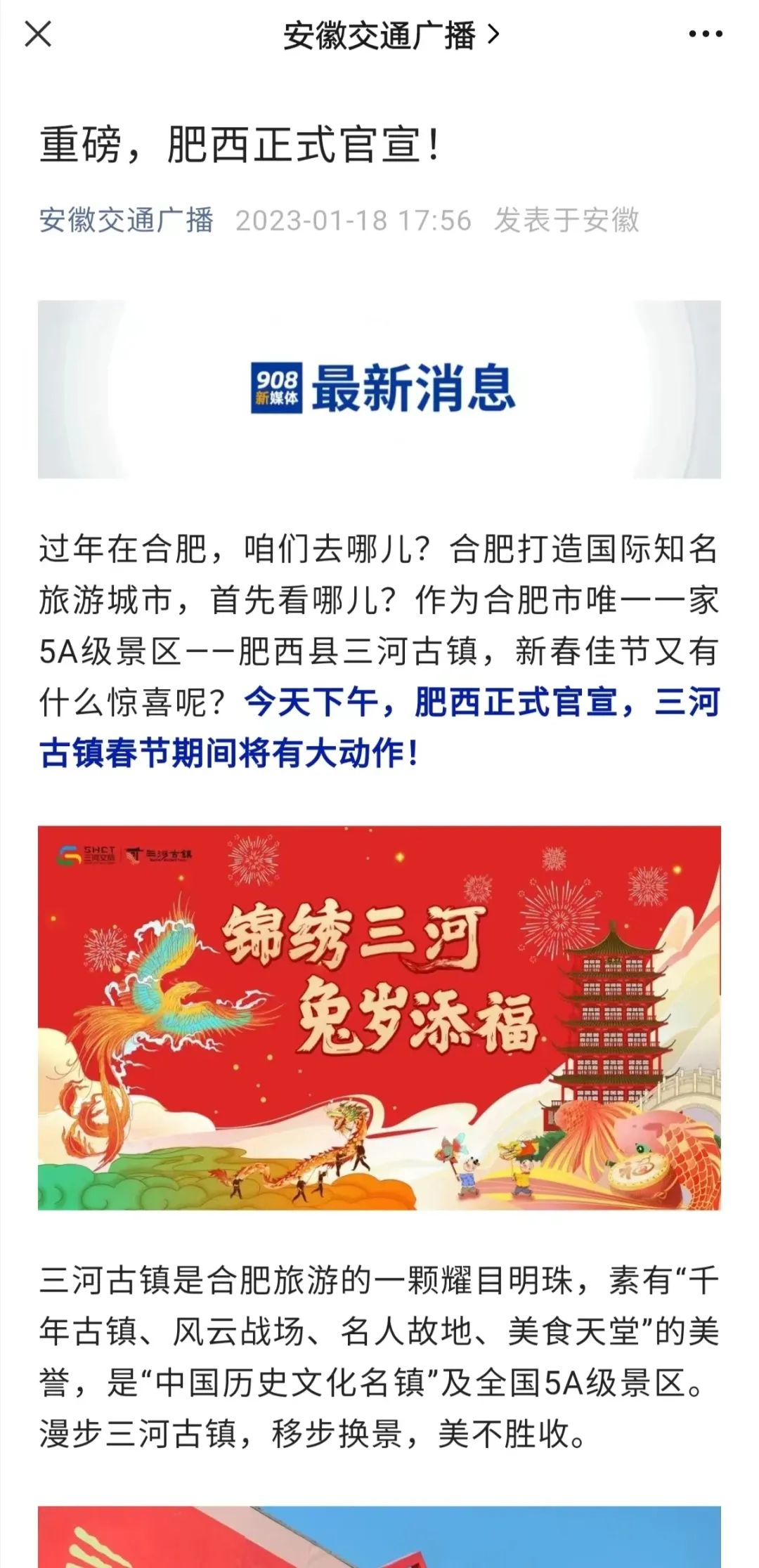 春節(jié)期間,三河古鎮(zhèn)景區(qū)熱鬧非凡,各種民俗文化、非遺體驗(yàn)、演藝活動等輪番上演。一經(jīng)亮相便引起了社會強(qiáng)烈反響。其中,中央電視廣播總臺多次赴三河古鎮(zhèn)進(jìn)行現(xiàn)場直播,人民網(wǎng)、安徽交通廣播、合肥新聞聯(lián)播、合肥日報(bào)等主流官方媒體紛紛進(jìn)行報(bào)道。