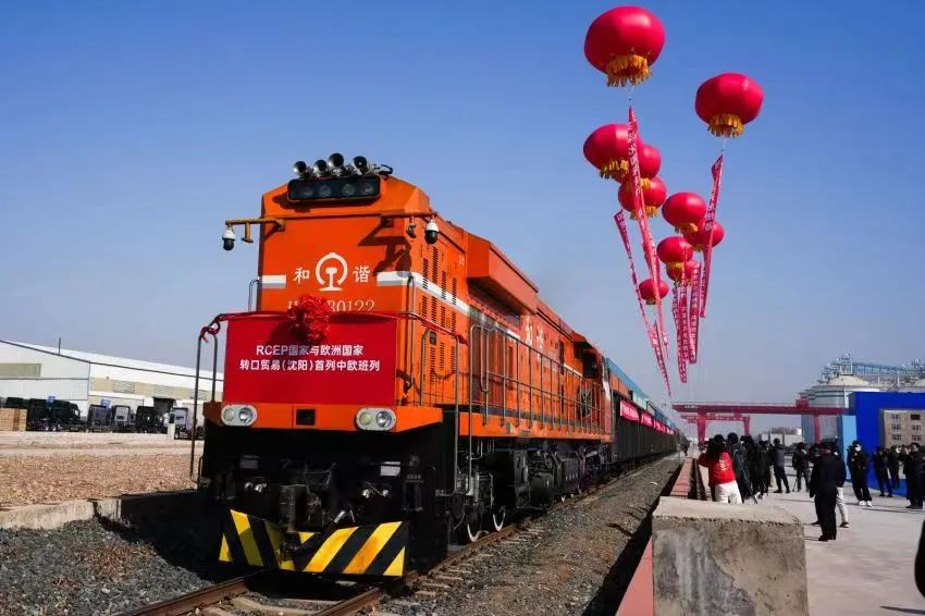 圖為RCEP國家與歐洲國家轉(zhuǎn)口貿(mào)易(沈陽)中歐班列首發(fā) 圖片來源:新華網(wǎng)