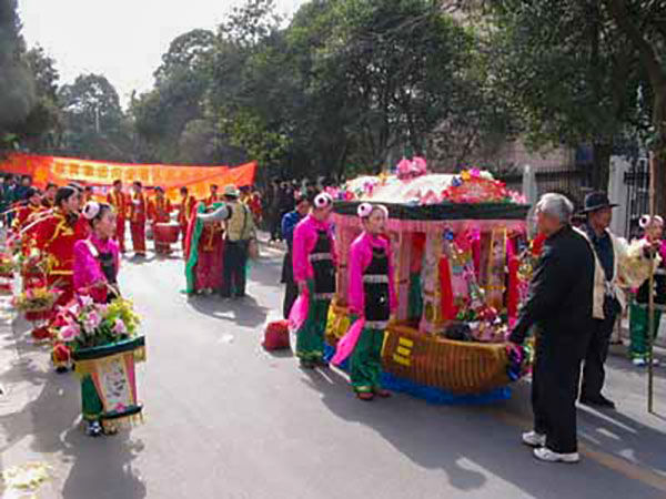 又名"旱地行舟”,道具有花船、漿、篙、挑燈和吹打樂器等。主要演員是“燈芯子”,一對(duì)“老夫妻”和一個(gè)丑角,共4人。表演時(shí)“燈芯子”在花船中間,一對(duì)“老夫妻”在花船兩冊,手持船漿并做劃船的舞蹈動(dòng)作,小丑在一旁逗笑戲語。還有伴舞的花挑子隨船行走,兒童組織的花籃隊(duì)唱著秧歌助興。