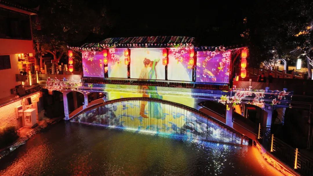 春節(jié)期間,三河古鎮(zhèn)以“三河明月夜”為主題打造的全浸式敘事游線,為游客帶來一場場水幕交融、電光流影、