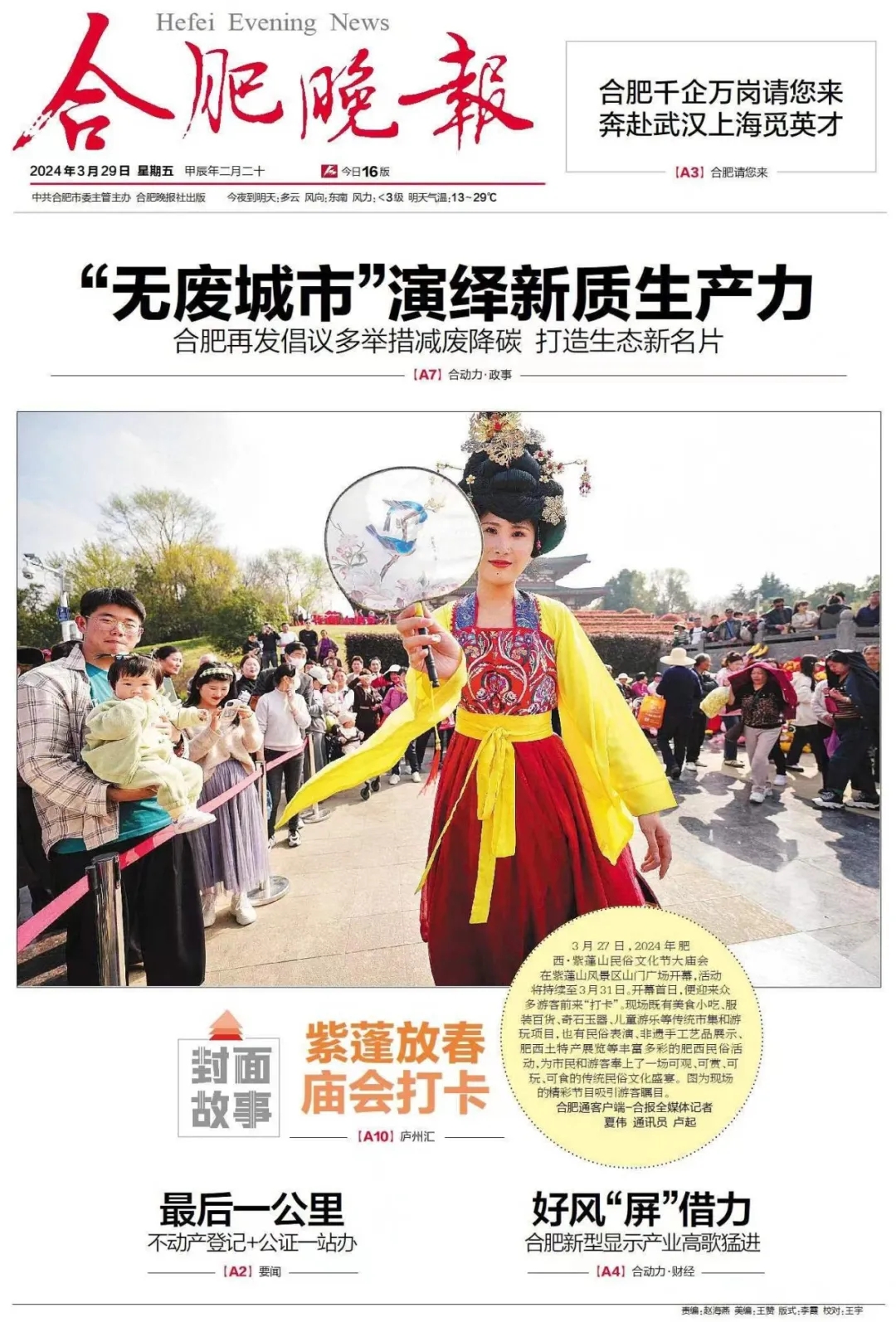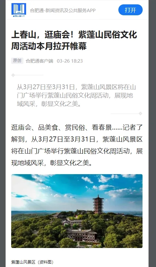 2024年3月27日,由紫蓬山管委會主辦,肥西縣文化和旅游局、肥西縣三河文旅發(fā)展有限公司協(xié)辦的“2024紫蓬山民俗文化周”在紫蓬山北廣場正式開幕,活動為期五天。