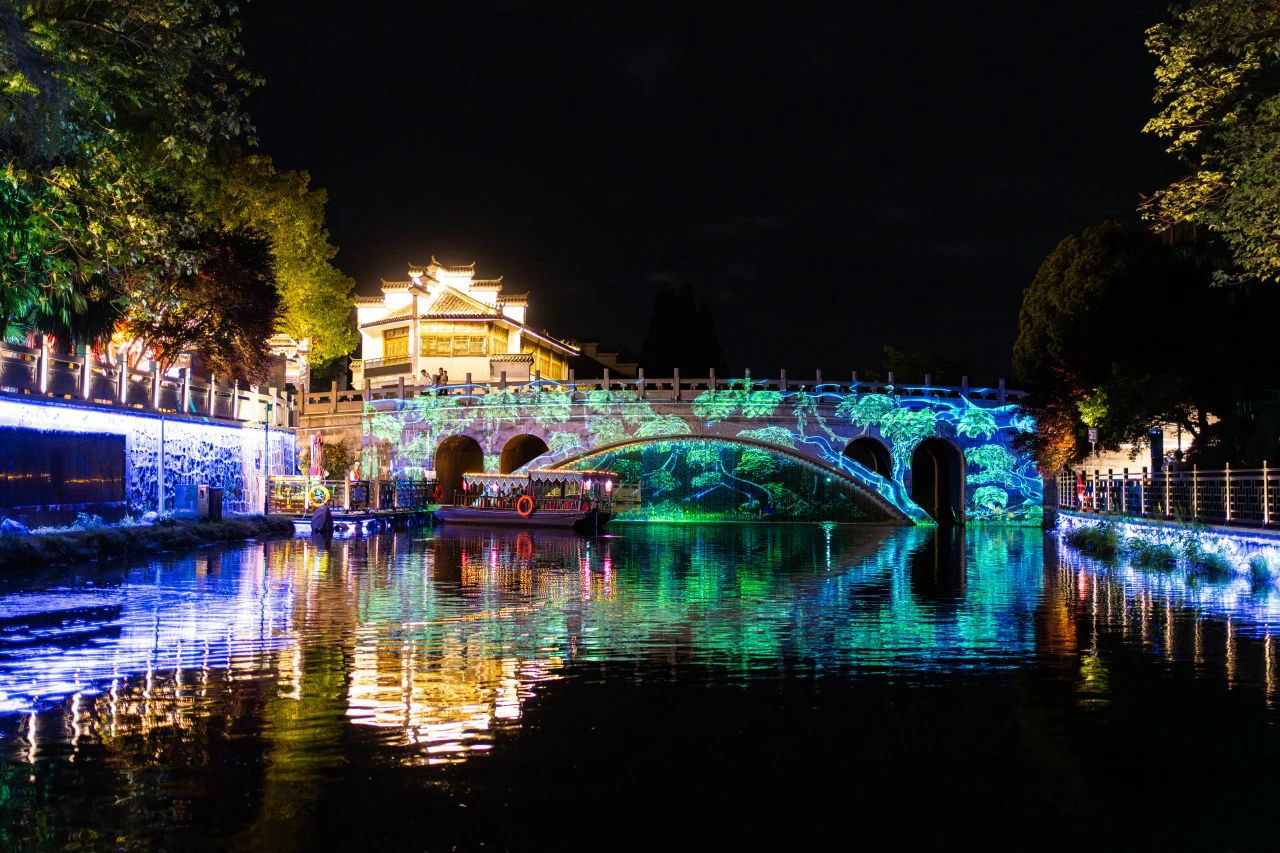 “三河明月夜”主題夜游路線是本次直播的“重頭戲”。以小南河為軸線,晚七點(diǎn),瑰麗奇妙的新鮮旅程即刻開啟。乘坐夜游船從游客中心碼頭出發(fā),經(jīng)過仙歸橋、對越橋、望月橋、三縣橋、鵲渚廊橋,至二龍橋碼頭為止。夜游船每經(jīng)橋下,都會(huì)觸發(fā)橋洞水簾投影,“越秀煙雨”“望月摘星”“水月聆風(fēng)”“鵲橋相會(huì)”“花好月圓”“江山千里”“夢回三河”等故事隨著游船的前進(jìn)一一上演,古鎮(zhèn)的前世今生就這樣穿過厚重歷史,繾綣低吟來到人們身邊。
