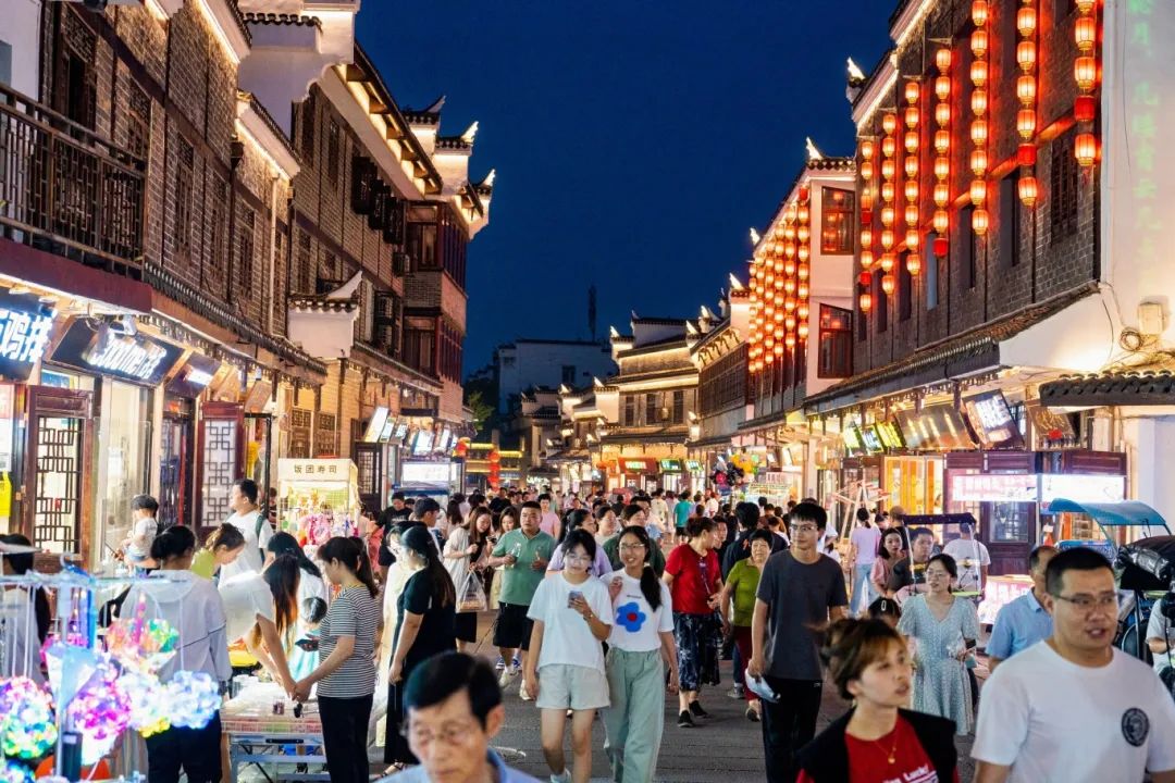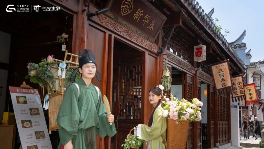 人群中還有宋代俊秀賣貨郎、俏生生的賣花娘,在徽式建筑“白墻黛瓦馬頭墻,回廊掛落花格窗”的映襯下,游客仿佛穿越回千年前。