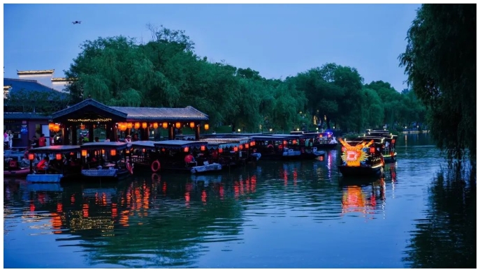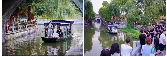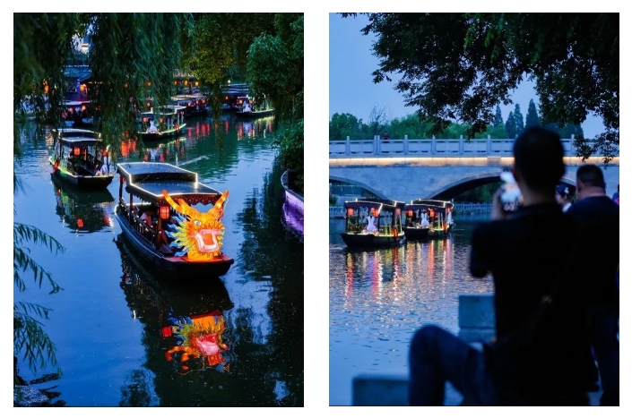 龍形游船徐徐航行,滿載著游客劃過兩岸,穿過橋洞、激起一陣陣碧浪。岸邊綠樹成蔭、花團(tuán)錦簇,楊柳樹彎腰垂下柔枝。