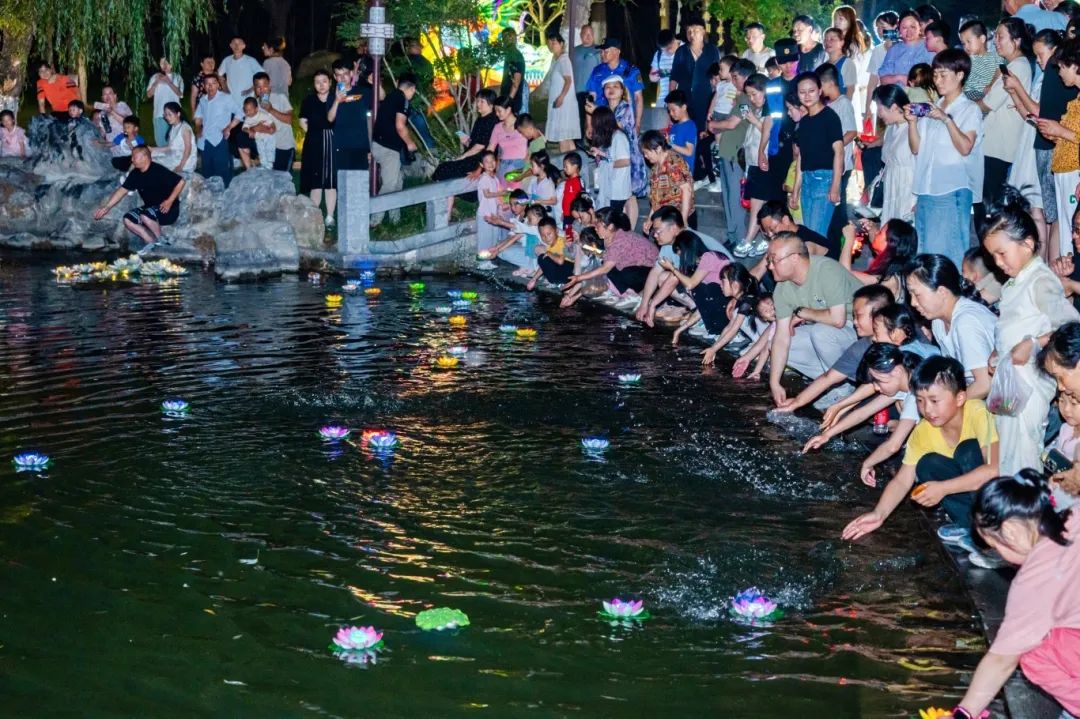 人間煙火氣,最撫凡人心。穿著漢服的小姐姐,纖手輕托一盞荷花燈,輕輕推入河中。花燈在碧波的蕩漾下,寄托著主人的美好愿景飄向遠(yuǎn)方。孩童亦學(xué)著大人模樣,放下一盞花燈,嬉笑著問媽媽它會(huì)流向何方。