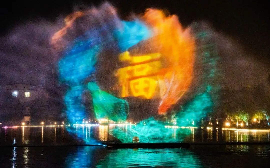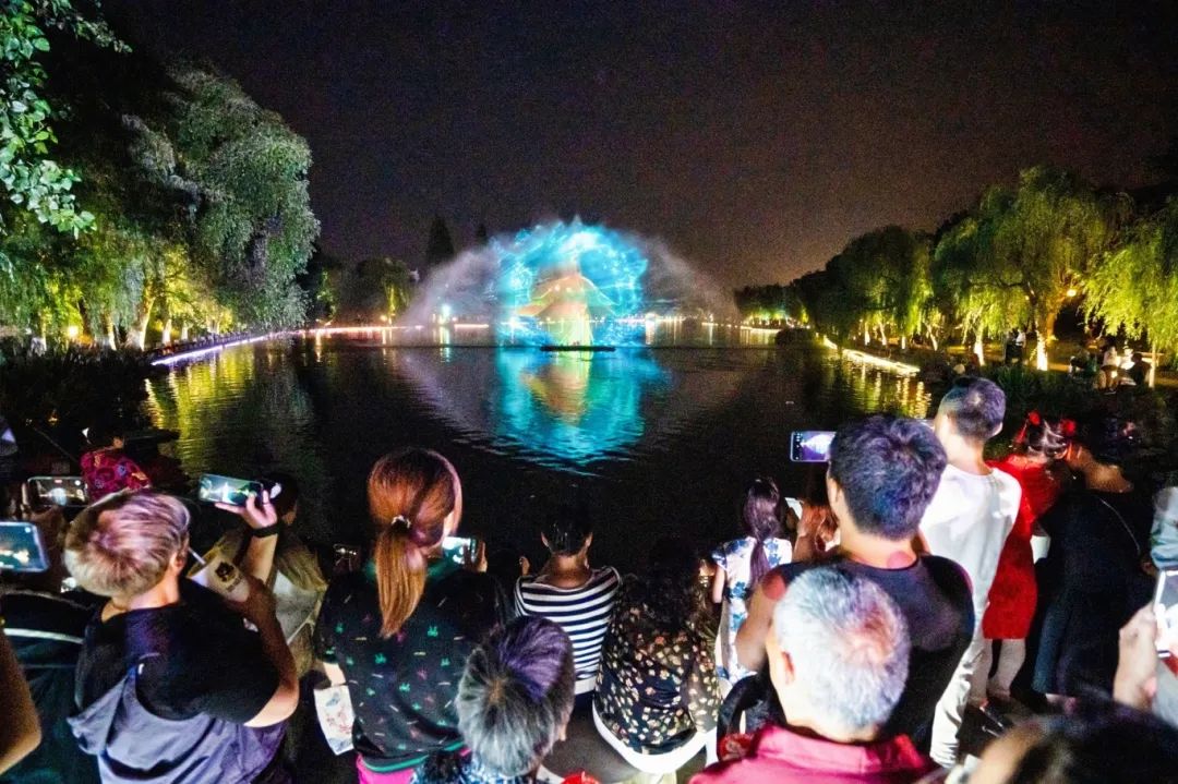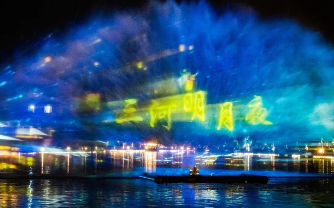 入夜,水上激光燈亮起,投射入水面,一時(shí)間河面燈光在水汽的氤氳下,如同海市蜃樓,分不清天上人間。